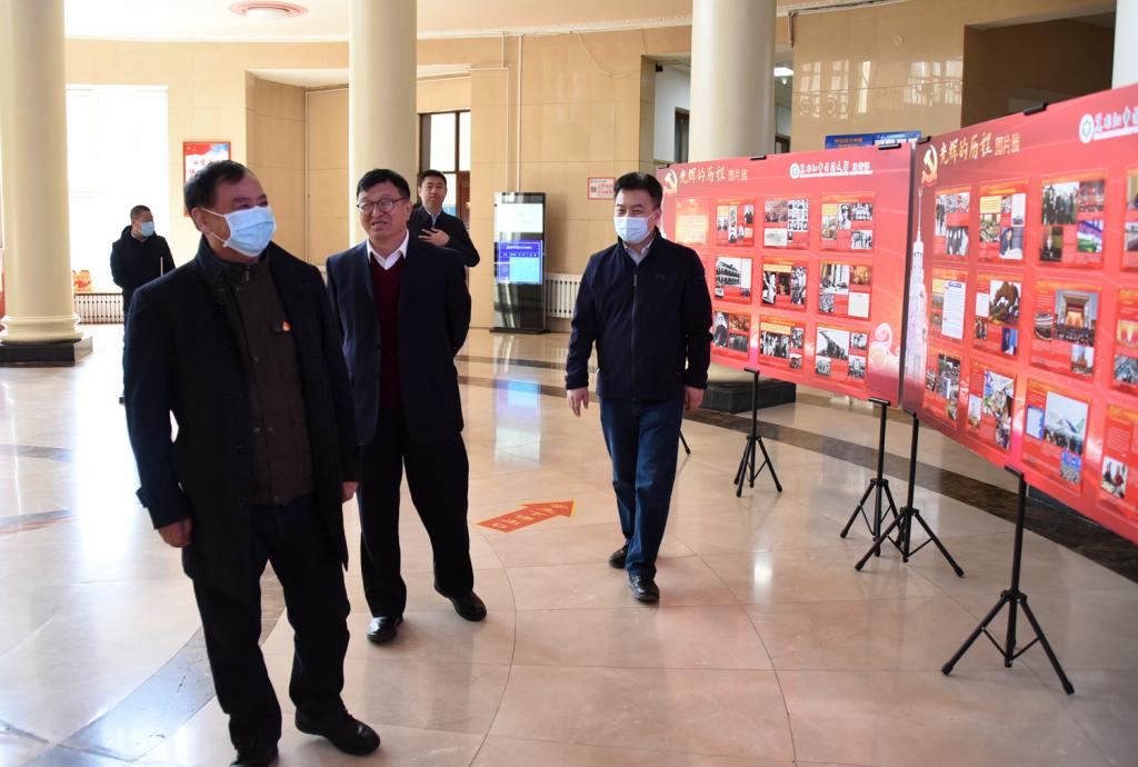 检查组一行还实地踏查了德赢在主楼圆厅展出的党的光辉历程专题图片展。