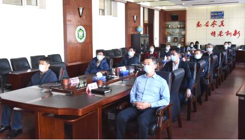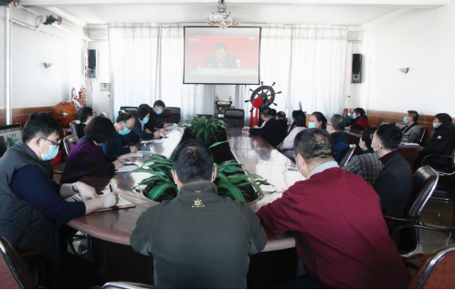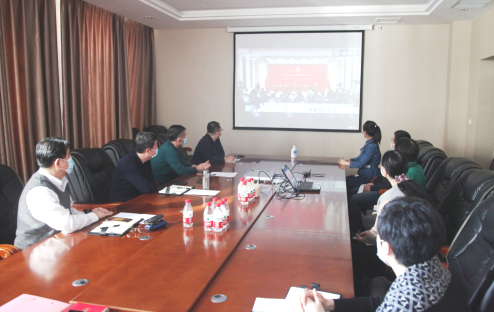 学校领导班子成员在主楼206会议室集中收看新闻发布会直播