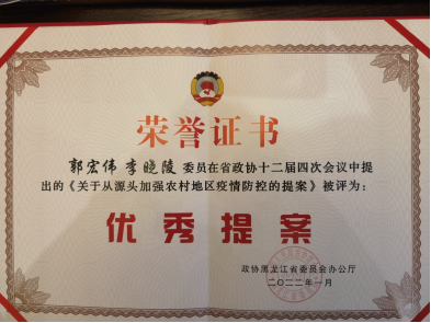 1月25日下午,黑龙江省政协十二届五次会议胜利闭幕,会议对省政协十二届四次会议以来35件优秀提案和100位履职优秀委员进行表彰,德赢郭宏伟、李晓陵、杨沈秋三名委员获评“履职优秀委员”荣誉称号;郭宏伟委员、李晓陵委员提出的《关于从源头加强农村地区疫情防控的提案》,王顺委员提出的《关于防止因病致贫、因病返贫的提案》获优秀提案奖;郭宏伟委员围绕推动龙江中药产业高质量发展,助力龙江全面振兴全方位振兴作大会发言。