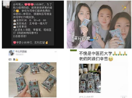 同学们纷纷在网上“晒”出收到的防疫药饮,以中医药特色为自豪