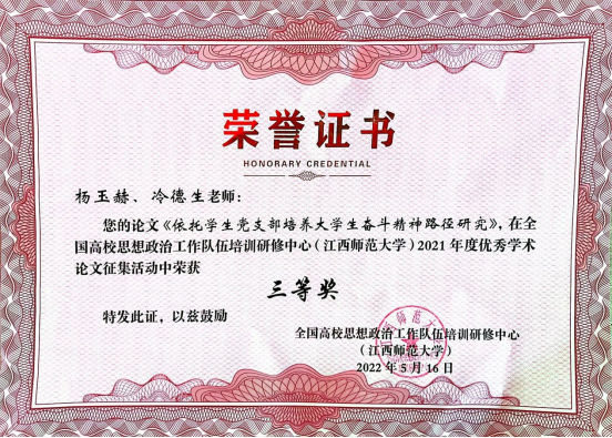近日,全国高校思想政治工作队伍培训研修中心 (江西师范大学)2021年度优秀学术论文评选结果公布,活动共征集学术论文 222篇,经专家小组盲审,共评选出75篇获奖论文。德赢第二临床医学院辅导员杨玉赫、冷德生共同撰写的论文《依托学生党支部培养大学生奋斗精神路径研究 》荣获三等奖。