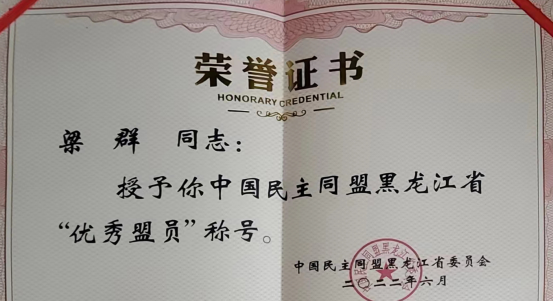 大会还对工作成绩突出的先进集体和优秀盟员进行表彰,梁群同志荣获中国民主同盟黑龙江省“优秀盟员”称号。