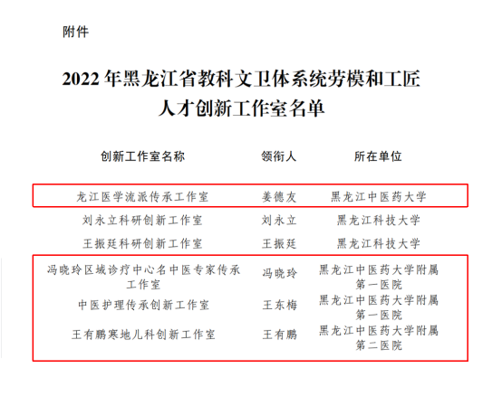 日前,2022年度黑龙江省教科文卫体系统“劳模和工匠人才创新工作室”专家评审工作圆满完成,共有25个单位的33个工作室被命名为“黑龙江省教科文卫体系统劳模和工匠人才创新工作室”。德赢基础医学院姜德友教授领衔的“龙江医学流派传承工作室”,附属第一医院冯晓玲教授领衔的“冯晓玲区域诊疗中心名中医专家传承工作室”,附属第一医院王东梅主任护师领衔的“中医护理传承创新工作室”,附属第二医院王有鹏教授领衔的“王有鹏寒地儿科创新工作室”名列其中。