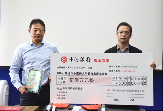 8月29日,哈尔滨敷尔佳科技股份有限公司董事长、总经理,黑龙江省工商联副主席、哈尔滨市工商联副主席、哈尔滨市人大代表,药学院1982级中药学专业校友张立国向学校捐赠教育教学发展基金500万元。vwin德赢ac米兰官网党委副书记、校长郭宏伟,党委副书记、工会主席乔广霞,党委常委、副校长杨炳友出席捐赠仪式。