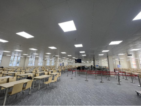 膳食中心四餐厅位于新建学生公寓南侧,与膳食中心一餐厅楼体相连,紧邻第一教学楼。餐厅建筑面积3000平方米,分上下两层,共有餐位约1200个。餐厅内部装饰秉持简洁明亮的装修风格,大厅内宽敞、通透,充满现代简约风格的桌椅摆放整齐。该餐厅采取开放式售餐模式,品种丰富的菜品摆放在带有加热装置的售餐台上,师生在售餐窗口自助选菜、取菜,使用统一托盘将菜品放到智能结算台结算,减少就餐高峰时段的排队现象。