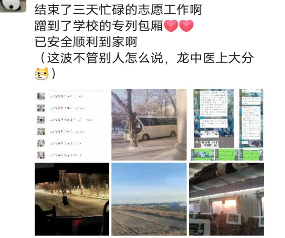 校团委积极开展学生志愿者服务工作,组织招募、防疫培训、确立分工、集结布置,并根据学生出行人数情况,协调车辆时间;在第一教学楼、体育馆前设立两个“一站式”服务点,100余名学生志愿者分组分批审核信息、扫码登记、发放物资、指引道路、搬运行李,从东方破晓到月夜微光,从凌晨3点半到夜晚23点,无论寒风凛冽还是雪花迎面,志愿者们始终坚守在返乡送站工作的各个岗位,展现龙中医学子的担当精神。