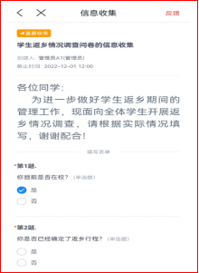 学生工作处、各学院利用今日校园平台发起离校返乡调研问卷,精准掌握每一名返乡学生的家乡地、离校时间、出行方式等信息,出行前一天发布天气预警信息,为返乡学生开具“离校返乡证明”;医务处每天为返乡学生提供免费核酸检测;资产管理处免费为返乡学生发放医用N95口罩,为返乡学生提供便利条件。