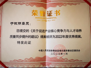 李和伟荣获“2022年香坊区优秀政协委员”,乔艺撰写的提案《关于加强社区医疗建设 提高人民健康水平的建议》获得“2022年度优秀提案奖”,于钦明撰写的提案《关于促进产业核心竞争力与人才培养质量同步提升的建议》获得“2022年度优秀提案”。