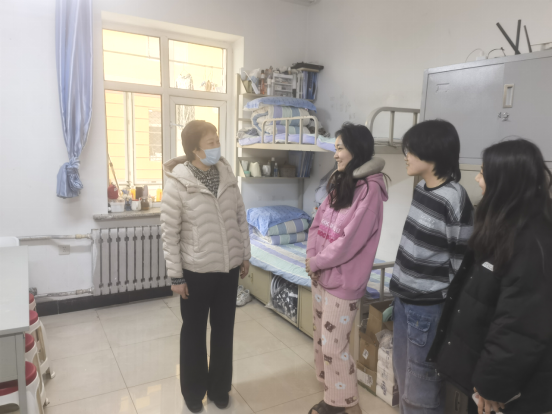 在走访慰问中,乔广霞与同学们亲切交流,耐心询问同学们的寒假生活、健康状况和返校后的适应情况,悉心叮嘱同学们在春季传染病高发期要注意个人防护和寝室卫生,提高寝室消防安全意识。她勉励大家要勤奋学习,做好新学期学业规划,不负时代,不负韶华。