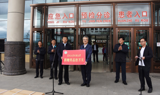 赵炜明代表学校党委向延寿县中医院捐赠价值10万元的医疗药品
