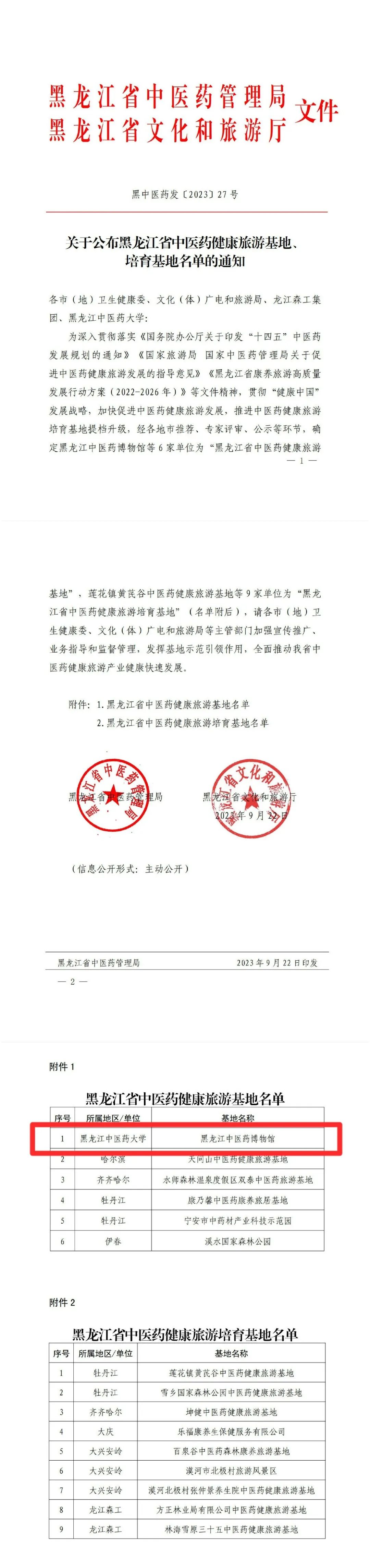 近日,省中医药管理局、省文化和旅游厅公布了黑龙江省中医药健康旅游基地、黑龙江省中医药健康旅游培育基地名单,德赢中医药博物馆获评“黑龙江省中医药健康旅游基地”。