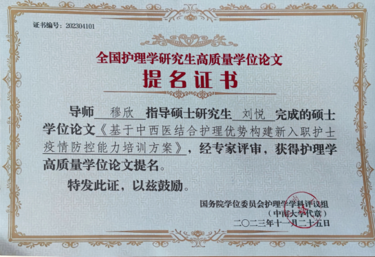 11月23日至25日,国务院学位委员会护理学学科评议组在海南省三亚市举办2023 全国护理学学科建设大会暨护理学研究生高质量学位论文交流会议。大会对2020~2023年博、硕士高质量学位论文进行表彰,由德赢穆欣教授指导的2018级护理学硕士研究生刘悦的学位论文《基于中西医结合护理优势构建新入职护士疫情防控能力培训方案》经过推荐、初评、复评,获评为高质量学位论文提名奖。