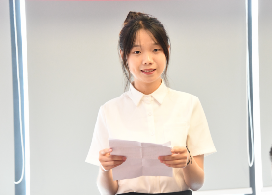 “清澈的爱,只为中国”的“壁纸女孩”、2022级中医学专业的谢婉妍同学作为学生代表发言,她将自己爱国奉献的心愿与敷尔佳的企业文化“让世界见证中国之美”相结合,表达了锤炼过硬本领,勇担强国使命的决心。