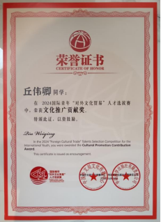 5月28日,由中国外文局文化传播中心和华语教学出版社联合主办的2024国际青年“对外文化贸易”人才选拔赛颁奖典礼暨归国创业培训启动仪式在北京举行,活动对优秀作品进行表彰。德赢选手匈牙利籍留学生桂鸢尾荣获文化推广卓越奖、马来西亚籍留学生丘伟卿荣获文化推广贡献奖,德赢国际教育学院辅导员张蕊馨获优秀指导教师奖,学校荣获优秀组织奖。