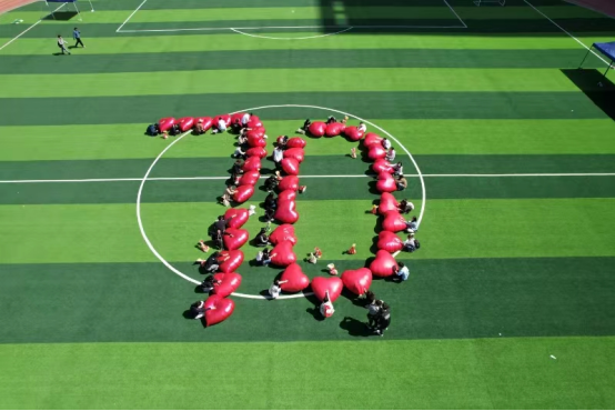 学生用心形气球拼成“70”字样庆祝学校建校70周年