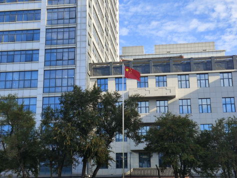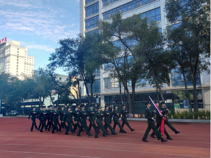 学校国旗护卫队升国旗,全体人员面向国旗肃立,行注目礼,庆祝新中国75周年华诞。