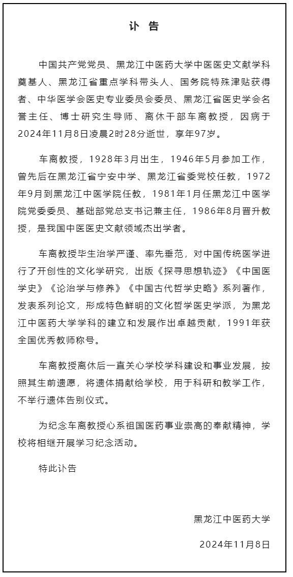 讣告丨沉痛悼念德赢中医医史文献学科奠基人、全国优秀教师车离同志