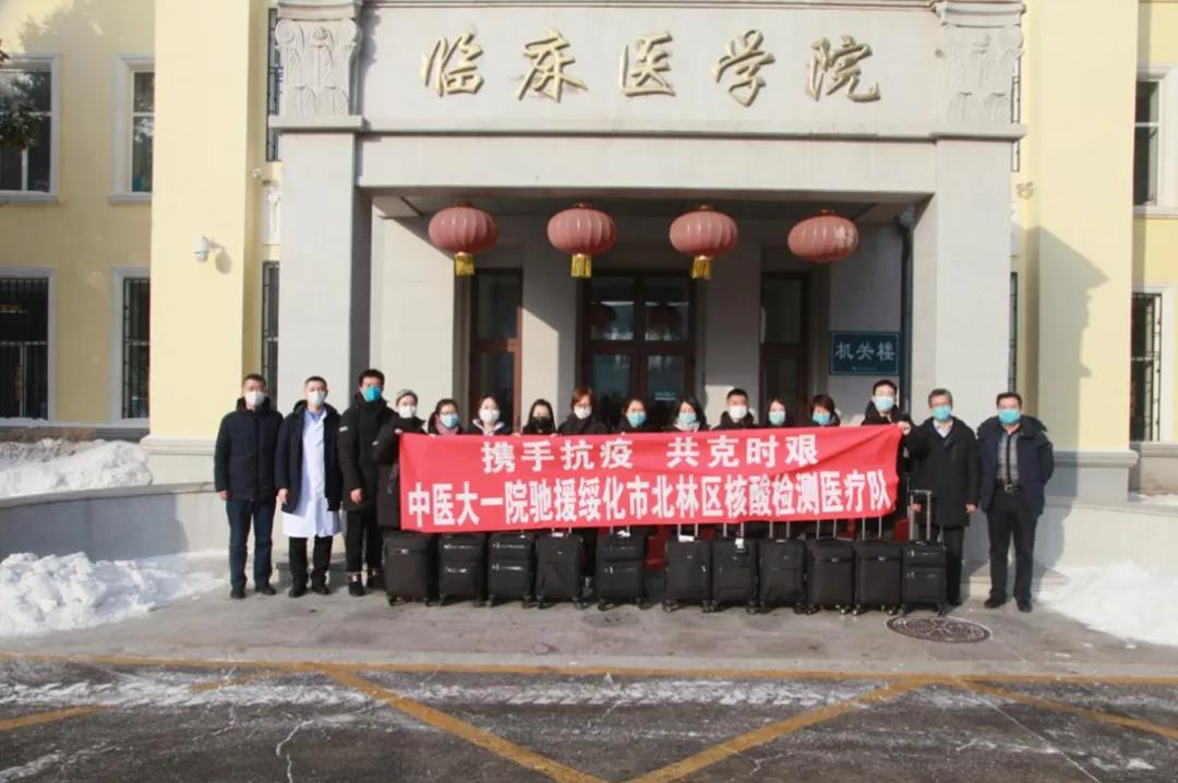 附属第一医院先后派出两批共136名医护人员组成的团队,赴哈尔滨市香坊区、道里区的十余个社区支援核酸采集工作。由于采样量巨大,医护人员分为4-6组,每6-7小时换岗,有时要奋战到凌晨,累得胳膊酸痛无法抬起。由该院党委书记李建民带队、12名核酸检测经验丰富的医护人员组成的医疗队,于1月26日上午启程,驰援绥化市建设符合生物安全二级标准的移动方舱实验室,协助当地安全、快速、有序开展新冠肺炎病毒核酸检测工作。随医疗队一同带去的5万份检测试剂和耗材,以及防护、消毒用品保障医疗队员们在抵达目的地后,能够快速开展工作,承担区域机动核酸检测任务。