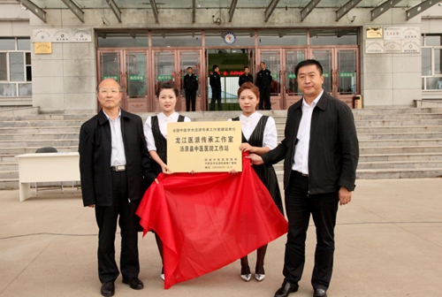 | 龙江医派研究会会长、德赢附属第一医院院长姜德友(左一)为龙江医学流派传承工作室汤原县中医医院工作站揭牌 |