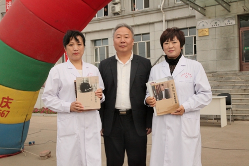 | 龙江医派研究会副会长、德赢附属第二医院院长唐强(中)向龙江医学流派传承工作室汤原县中医医院工作站赠书 |