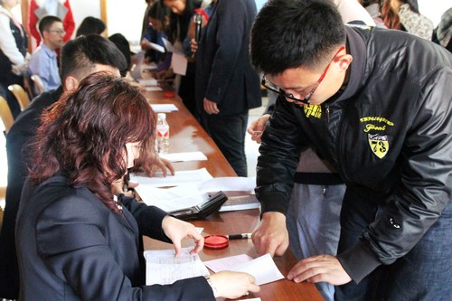 10月21日下午,2015级新生国家助学贷款签约仪式暨诚信教育大会在大学生活动中心第一活动室举行。173名获得校园地国家助学贷款资格的同学在仪式上进行了集体诚信宣誓,并与该贷款的省属高校承办单位——哈尔滨银行现场签订了助学贷款借款合同。
